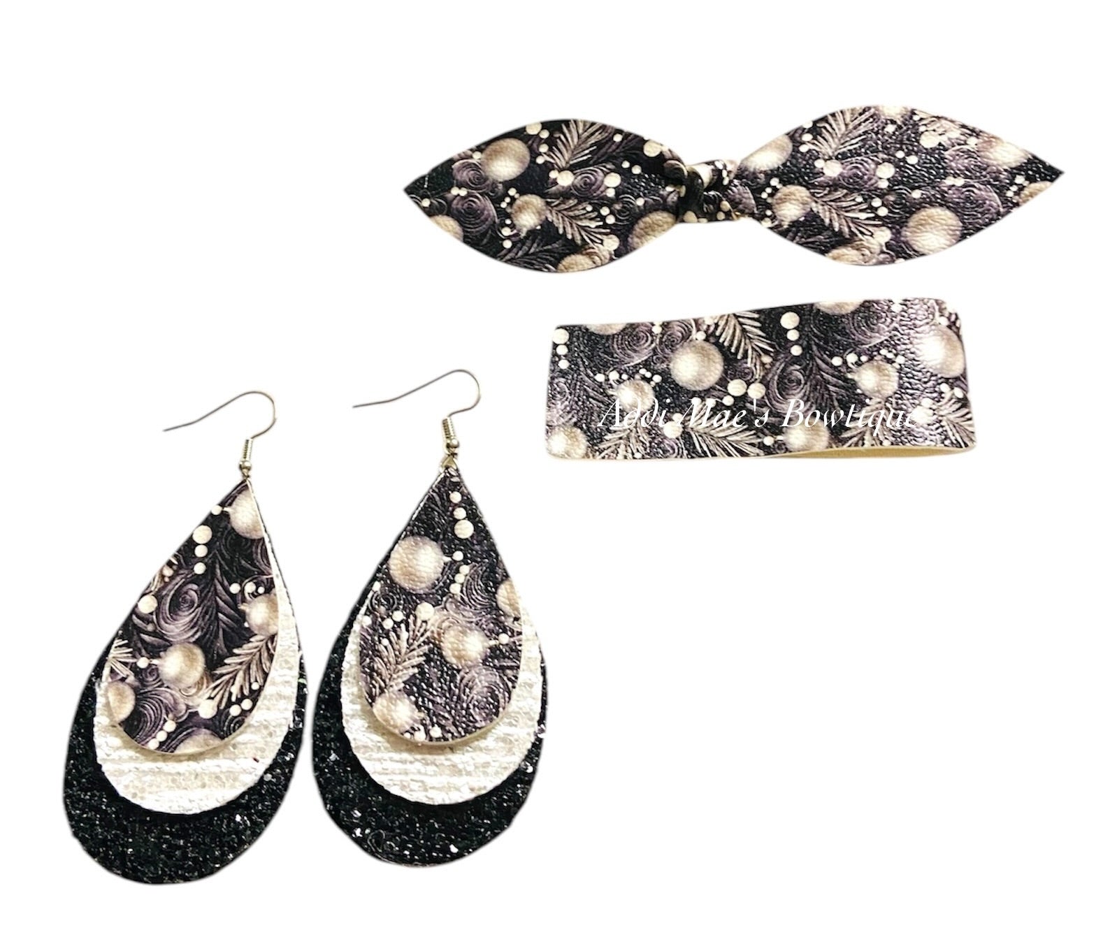 Black and Silver Christmas Ornaments Top Knot Clip, 2” Snap Clip, & Earrings Set