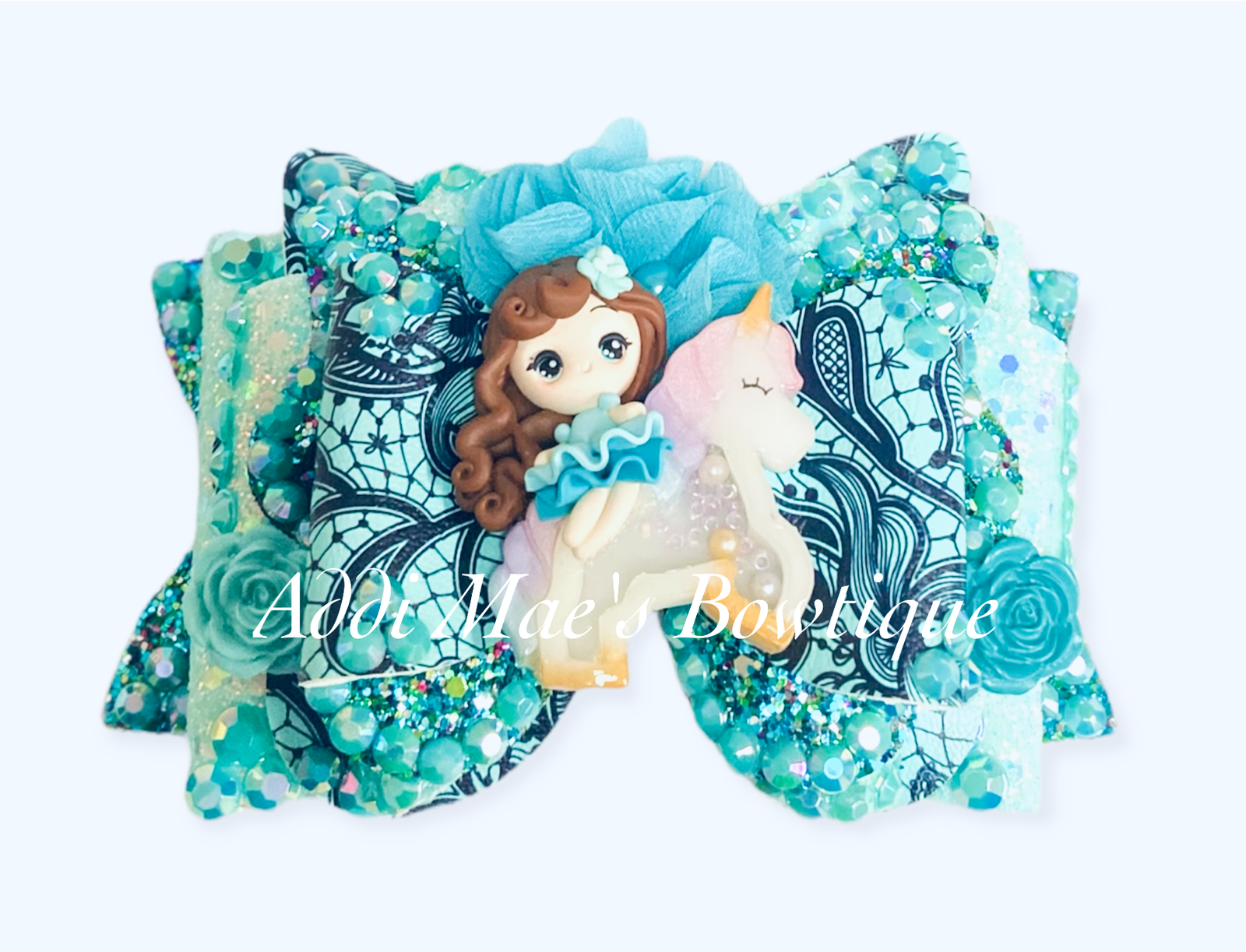 This listing is for one large 5” faux leather bow. It has a clay center unicorn.