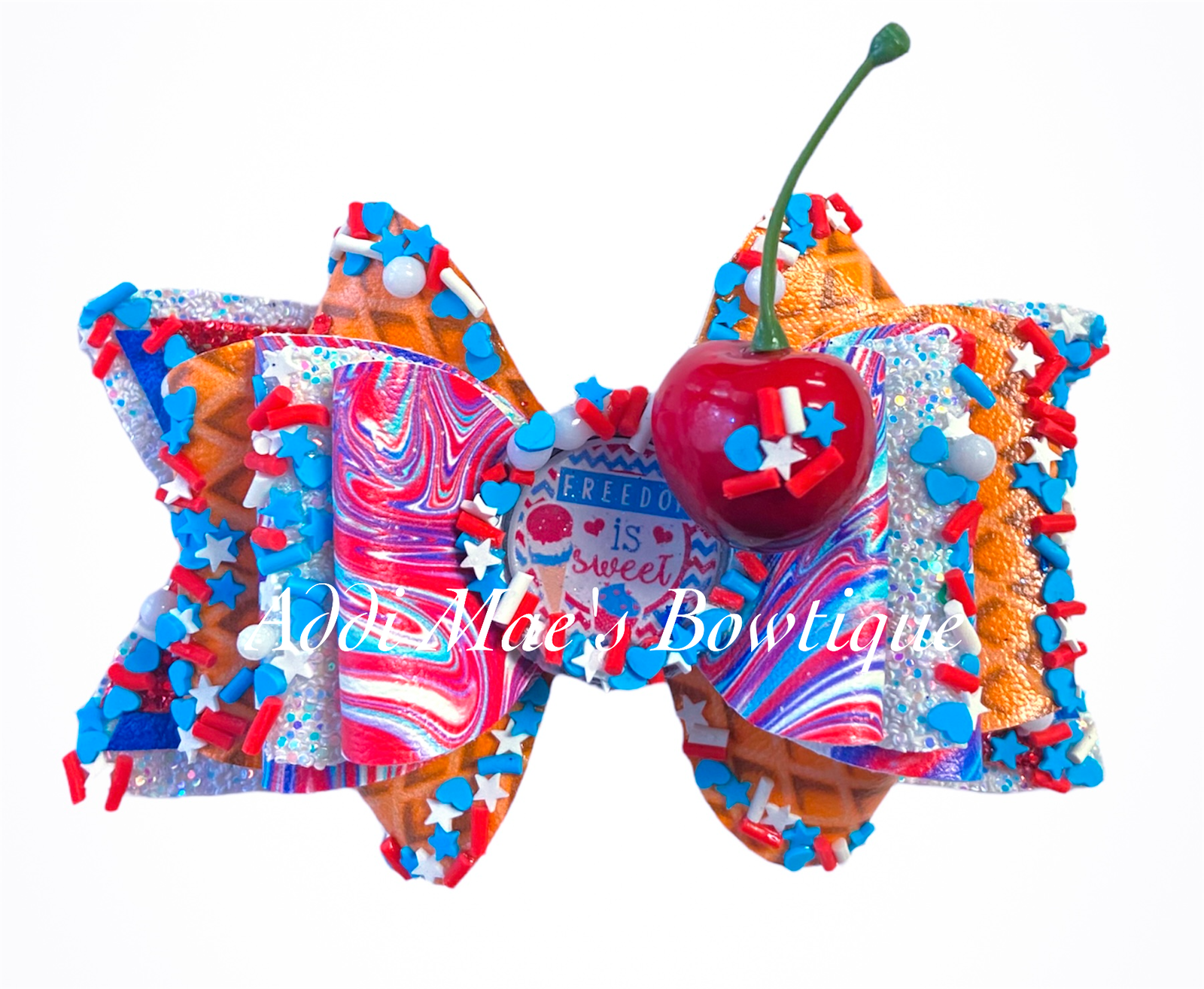 This listing is for one large 5” faux leather bow. It has red, white, and blue sprinkles and a cherry .