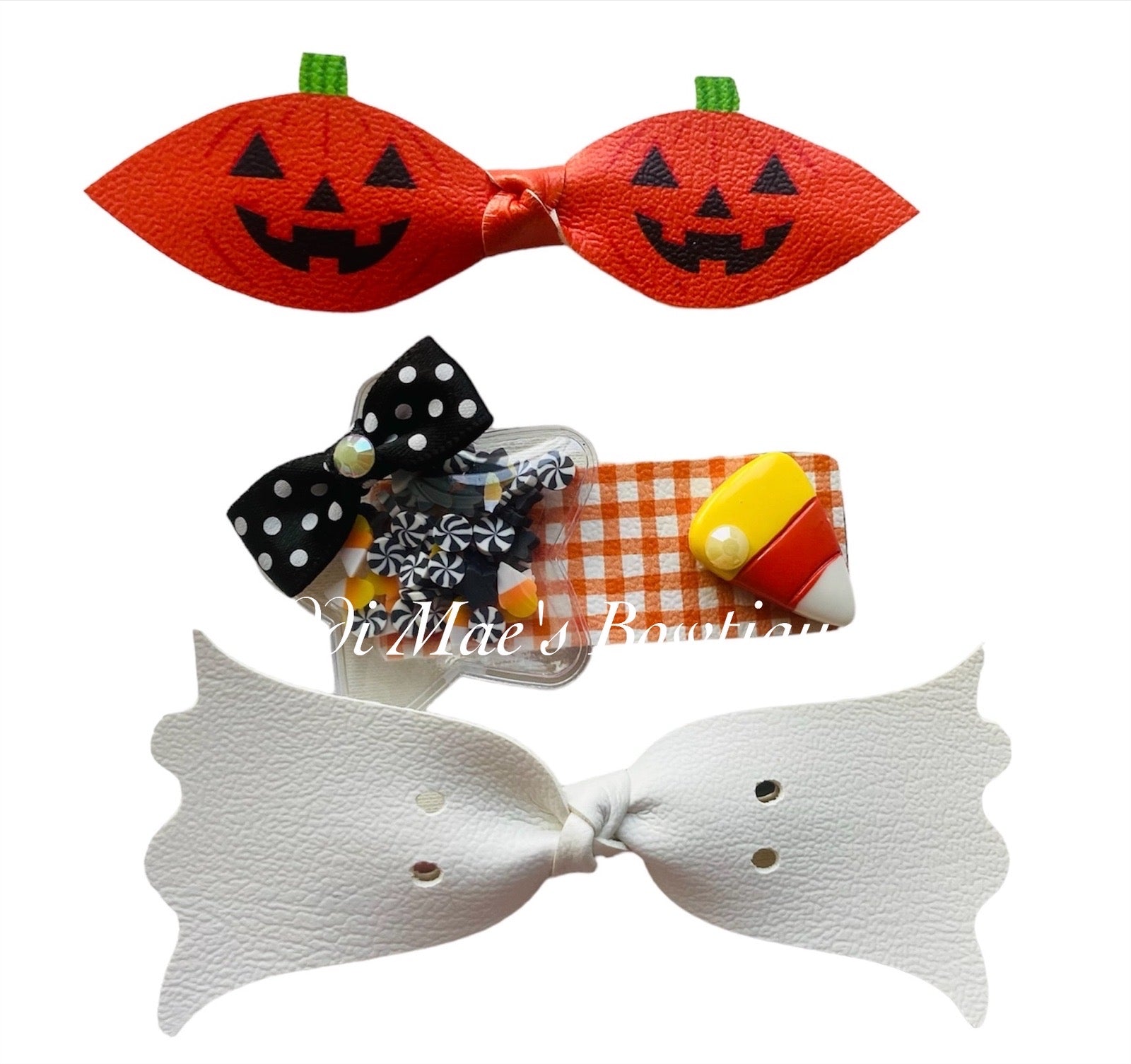 This listing is for one ghost top knot clip, one Jack o lantern top knot clip attached to a 3”alligator clip with teeth and a matching candy corn 2” snap clip.