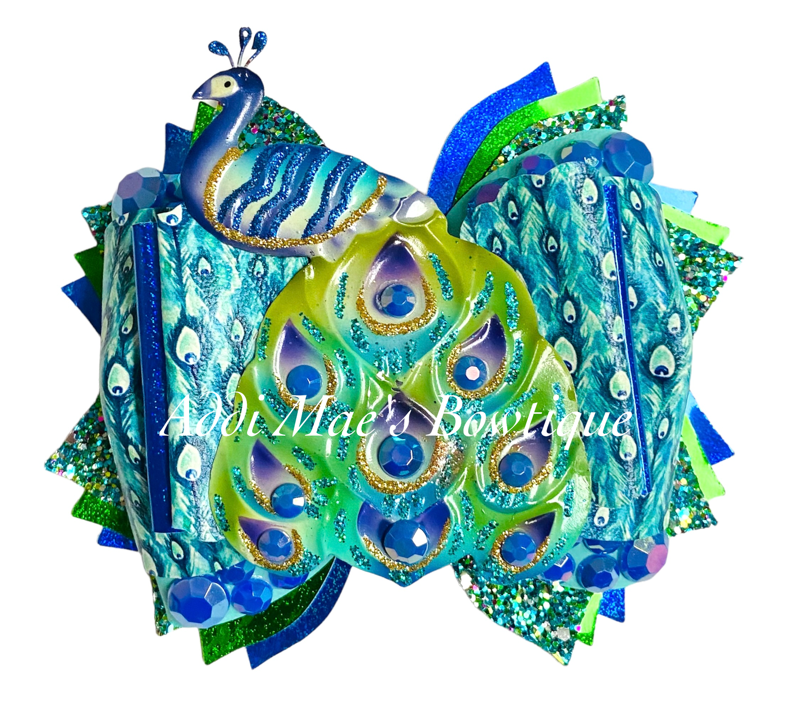This listing is for one large 5” faux leather bow with a lightweight peacock center.