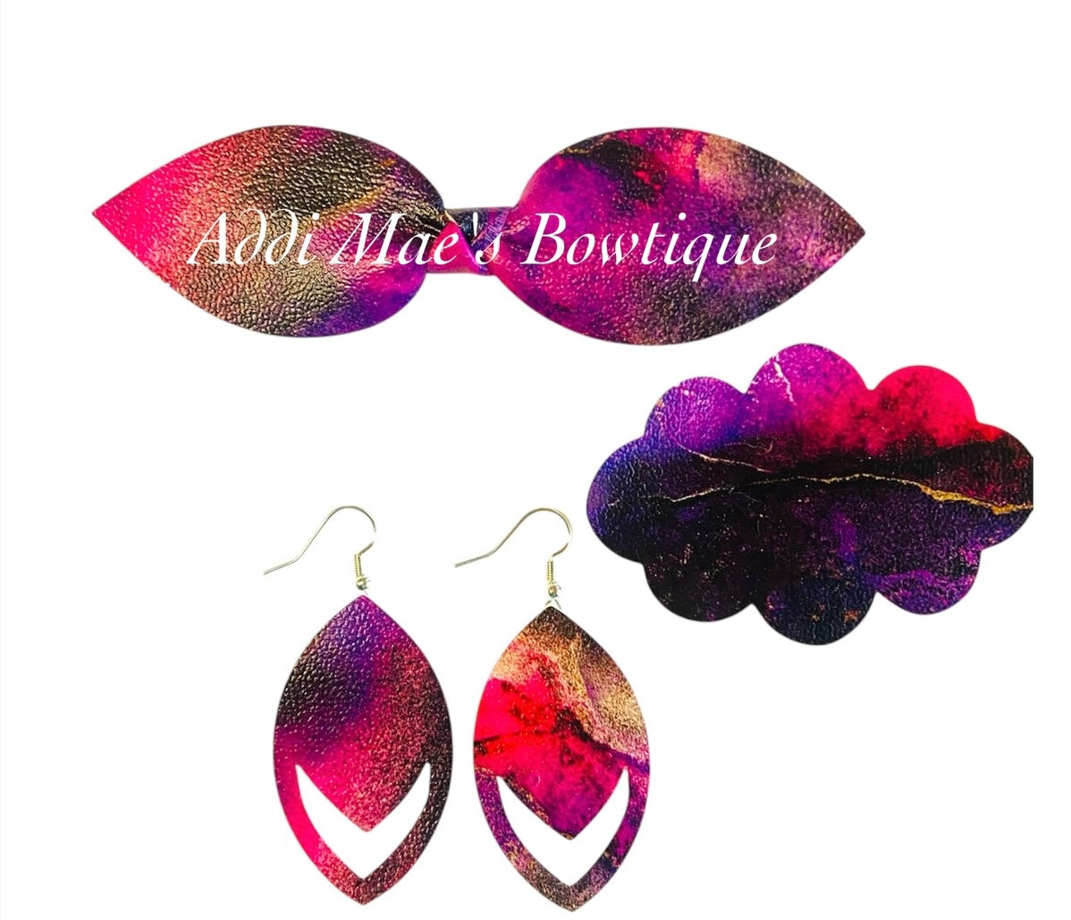 Purple, Pink, Gold Foil Top Knot Clip, 3” Snap Clip, & Earrings Set